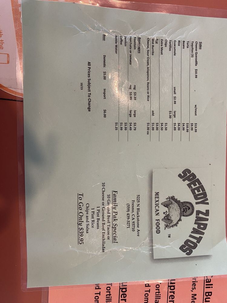 Welcome to Speedy Zapatos Mexican Food, a vibrant gem located at 5225 N Blackstone Ave, Fresno, CA. This eatery offers a delightful array of authentic Mexican dishes, perfect for a casual meal with family or friends. Their menu features mouthwatering options such as the Supreme Burrito, packed with your choice of meat, fresh toppings, and served alongside delicious sides. If you're in the mood for something comforting, the Menudo Soup is a must-try!
